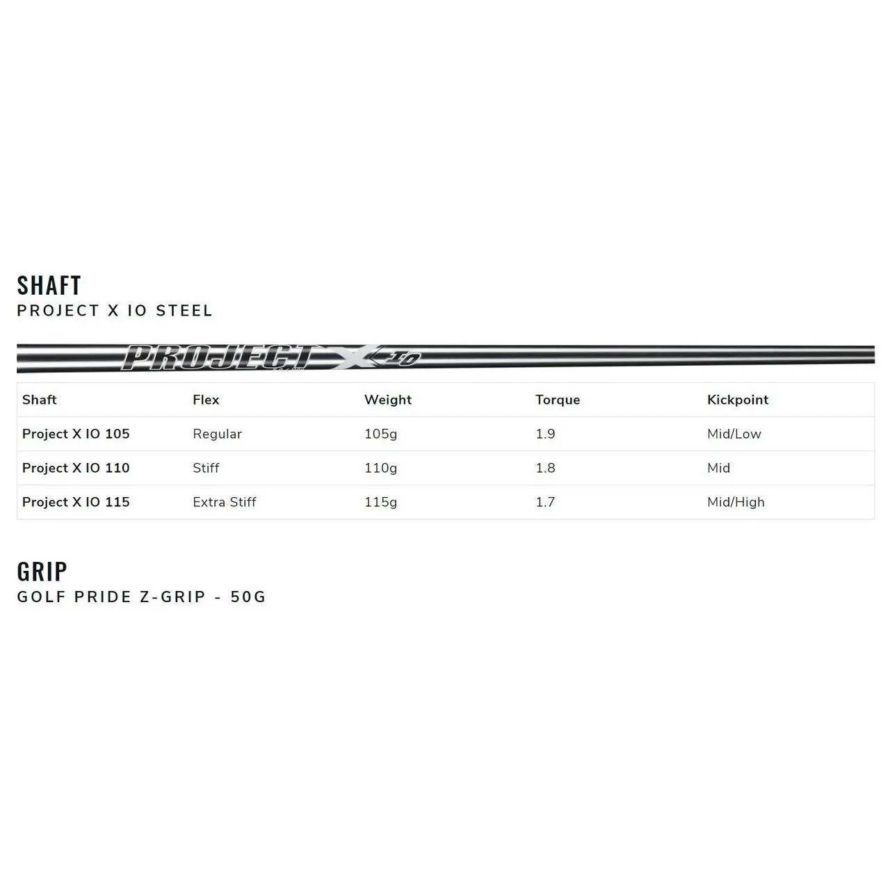 The Project X IO is individually optimized for each iron in the set. The Mitsubishi MMT is a player’s graphite shaft with metal mesh in the tip for stability. Golf Pride’s Z Grip features a firm feel and exceptional traction.