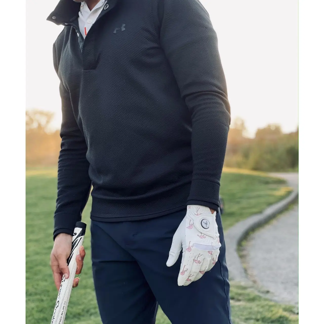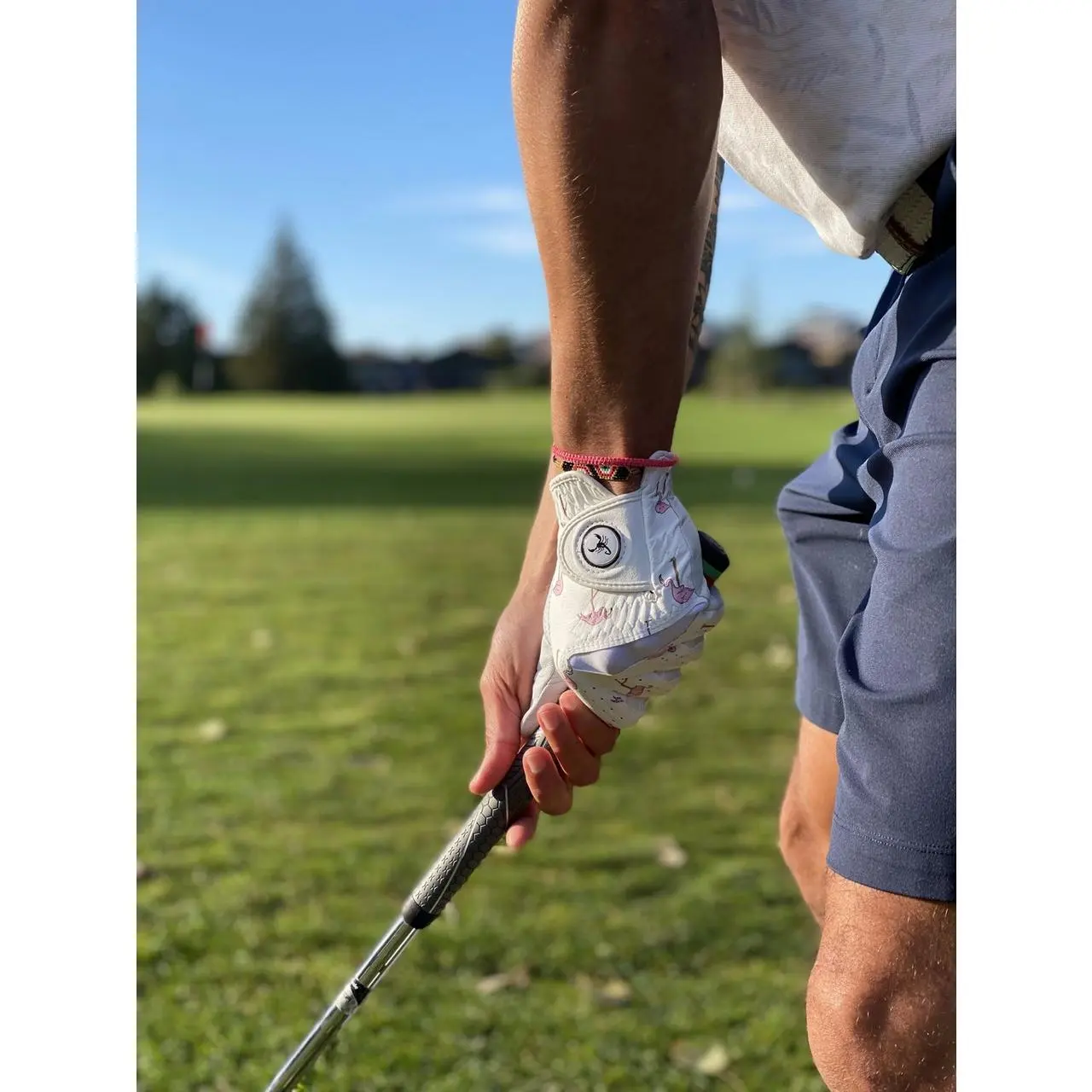 Enjoy a fun day at the course with our latest golf glove design. Classy white leather adorned with a colorful, yet elegant flamingo print.
