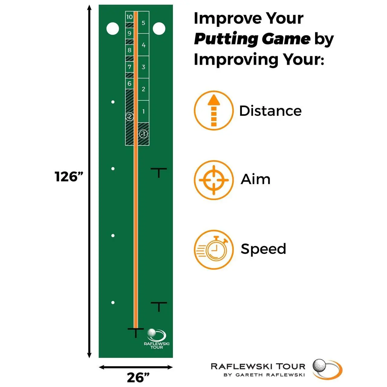 The Putting Mat is designed to work with The Raflewski Ruler and Discs & Dots to make a complete Putting Learning Program.